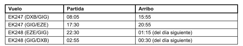 La frecuencia semanal adicional entre Brasil, Argentina y Dubái operará como EK247 y EK248 en una configuración de 2 clases. Los billetes ya pueden reservarse en emirates.com, la App de Emirates y las agencias de viajes.