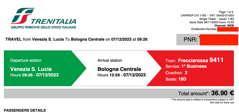 El pasaje que había comprado era en business porque costaba un poco más que el «normal». Acá se ve a 36,90 euros. El horario era 9:26 y llegando 10:59 a Bolonia