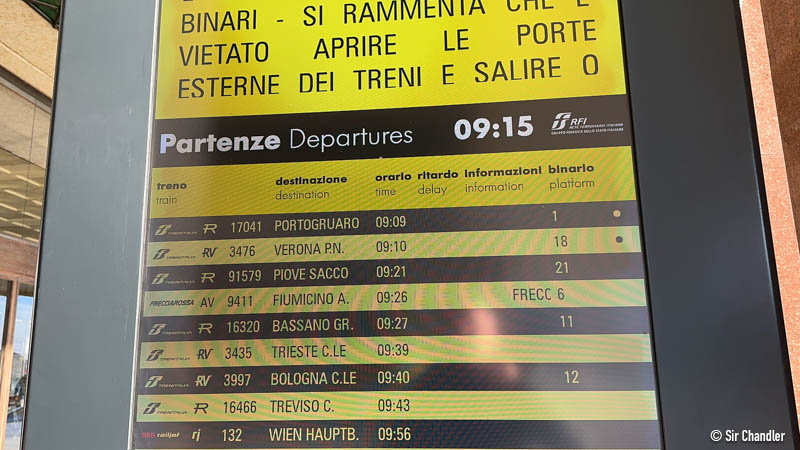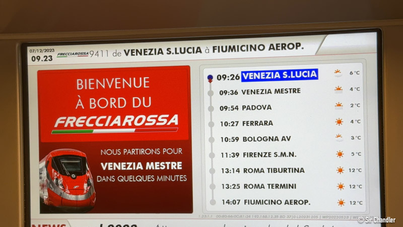 El tren salía 9:26 de Venecia, paraba enfrente en Mestre y terminaba 14:07 en el aeropuerto Fiumicino de Roma.