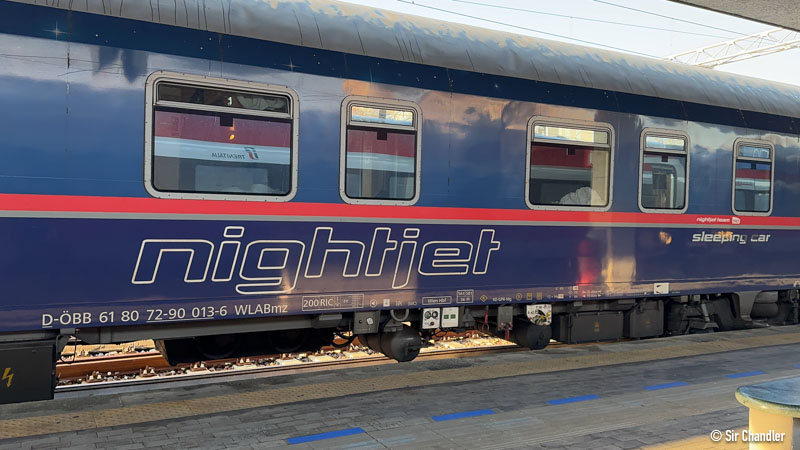 En mayo de 2018 hicimos el trayecto Venecia – Viena en el NightJet de Öbb. Camarote para dos, desayuno incluido con opciones que elegimos al subir. Tenía que salir a las 21hs y llegar a las 7.55 del otro día. Aunque salió más de una hora demorado (nunca supimos porque) recuperó en viaje.