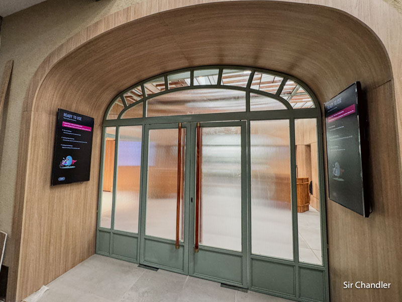 La puerta verde es la que da a la sala de embarque y es por donde entrará todo el mundo que tenga el acceso, que será chequeado en esos mostradores de la izquierda