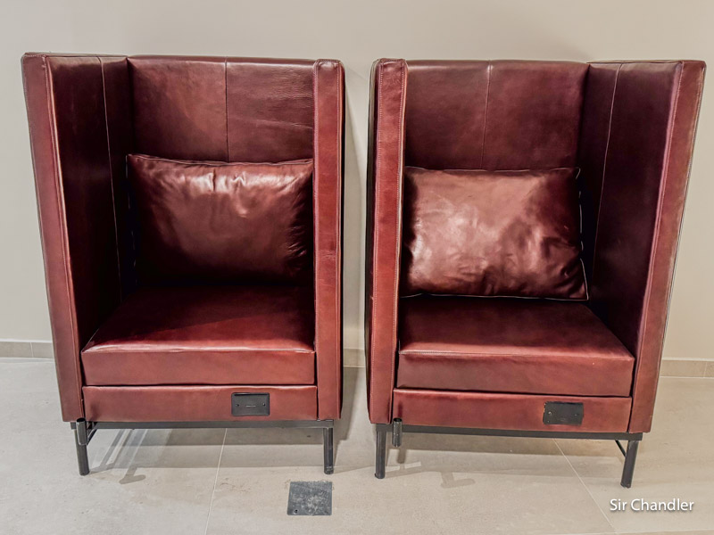 Hay muchos sillones individuales similares a los de varios VIPS en Estados Unidos, que permiten trabajar con una computadora en una mesita de metal que está adosada. Son más privados y sirven para absorber parte del sonido que pueda generar una charla telefónica. Ahí abajo se ve un enchufe en cada sillón, pero aun no están destapados