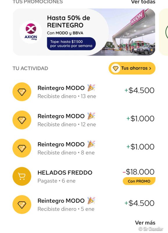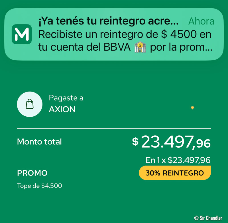 Acá un ejemplo, ayer cargando combustible con MODO BBVA en una AXION donde me devuelven 30% y en el momento me llegaron $4.500 a la cuenta del BBVA