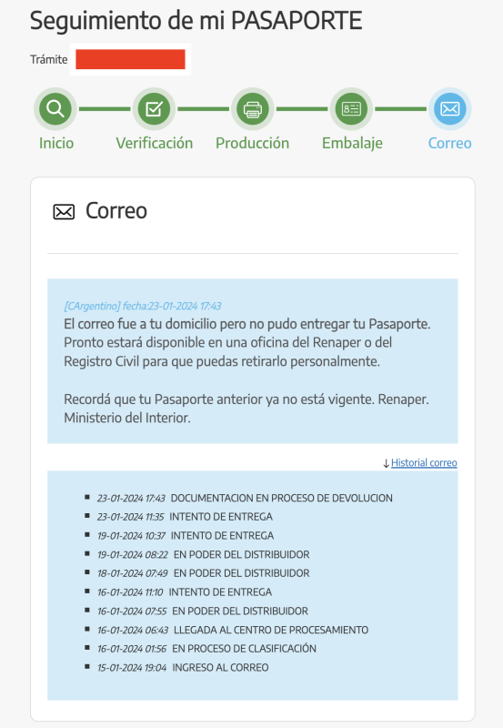El 12 hicimos el trámite (viernes), el lunes 15 ESTÁ ENTRANDO EL PASAPORTE AL CORREO, el 16 llega a la sucursal de reparto y ese mismo día «intento de entrega» que es una mentira y que ni papel dejaron…