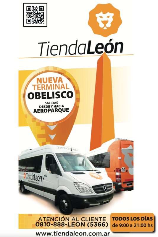 Tienda León comenzó a brindar un servicio en combi entre el Aeroparque Jorge Newbery de la ciudad de Buenos Aires y una parada en el Obelisco. ESTIMO que es en la terminal de combis que está debajo, pero espero confirmarlo en breve. CONFIRMADO ES EL ANDEN 16 DE LA TERMINAL DE COMBIS