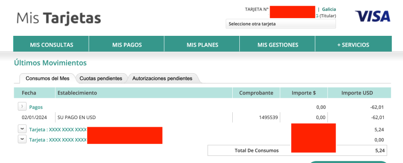 El martes pasado hice el pago con dólares del saldo de mi tarjeta Visa del Galicia y también de otra del Santander.