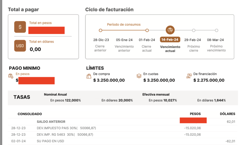 Ahora la de arena, o la de cal, es que acá se ve que es el resumen que vence ahora en febrero y recién ahí avisó que el 28 de diciembre, el día del cierre anterior… me dio vuelta los impuestos que me tocaban por el consumo de USD 62,01 que como se ve pagué el 2 de enero…