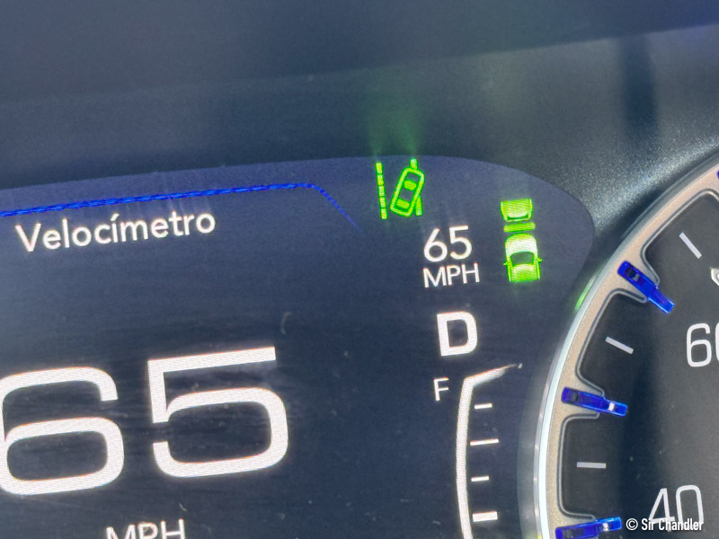 Que es lo que se ve ahí arriba a la derecha donde yo tengo marcada menor distancia con el auto de adelante. También tiene la asistencia de carril que lo muestra el que está por encima de la velocidad seteada de 65MPH (en ese momento)