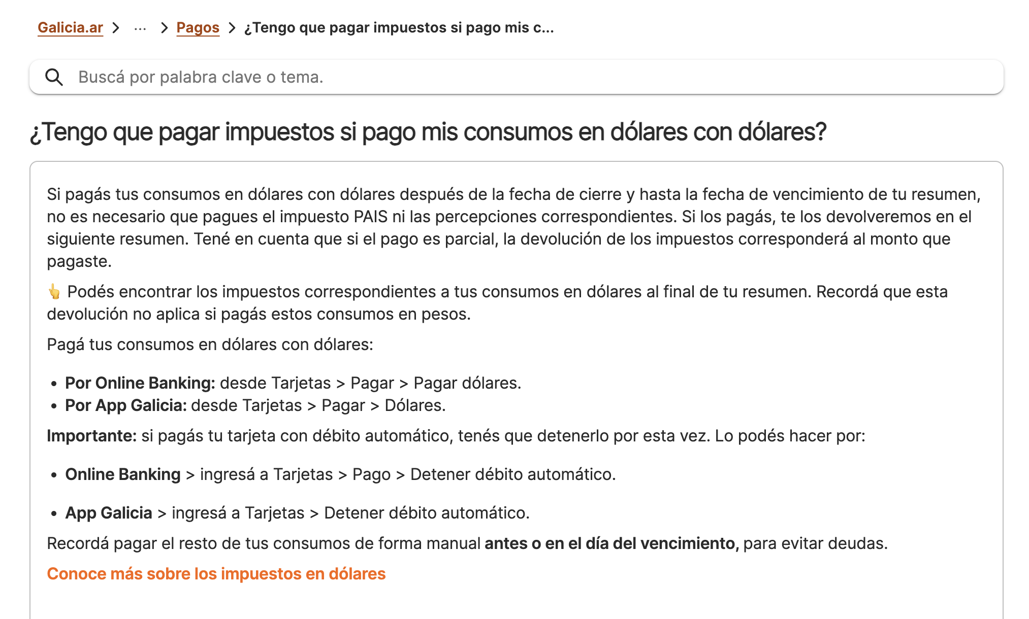 Esto no ayuda a «darle seguridad o confianza» a las personas actuando como el mismo banco dice que no lo pagues… https://ayuda.bancogalicia.com.ar/n4/tengo-que-pagar-impuestos-si-pago-mis-consumos-en-dolares-con-dolares