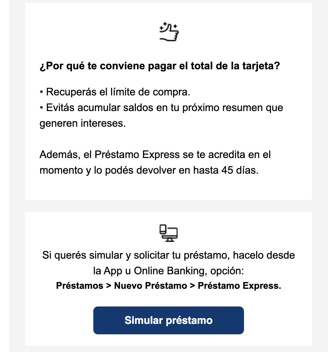 Hola Sir! Yo pagué todo el saldo de la Master (no tenía consumo en dólares) y como lo pagué el mismo día del vto se ve que no llegó a impactar (o el chasqui se atrasó) y me mandaron el mismo mensaje, ofreciéndome un préstamo para pagar… lo que ya había pagado. Consulté los comprobantes, por la dudas, y estaba bien clarita la fecha de pago del importe total. Así son estos dptos del banco que parecen de distintos países.