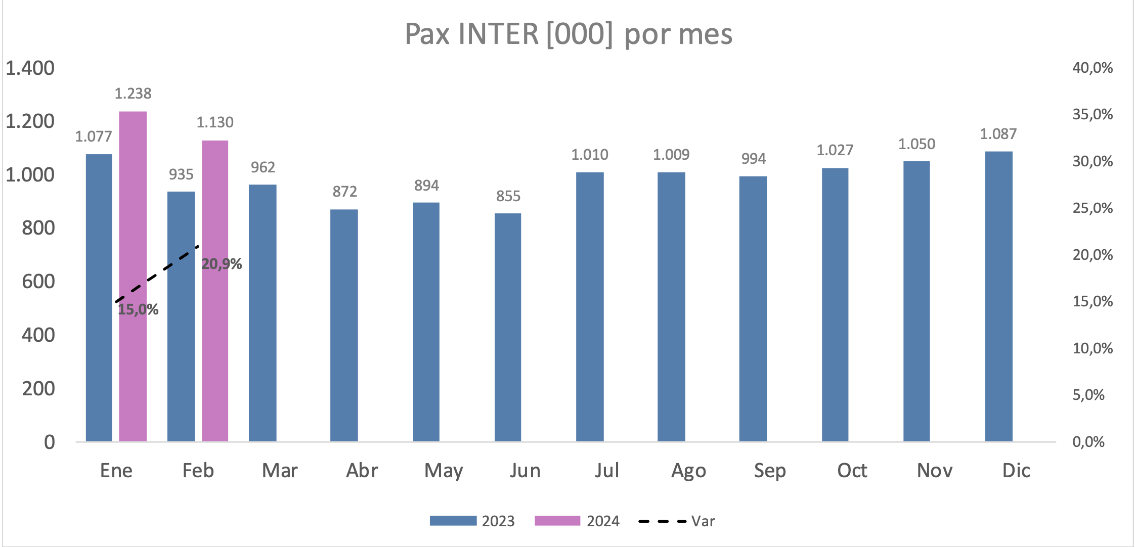 Por el lado de internacional también se movió más que el año pasado pero menos que en enero. Igualmente si vemos el 1.130.000 de febrero, es una cifra que no se tocó en ningún mes de 2023, ni siquiera en diciembre.