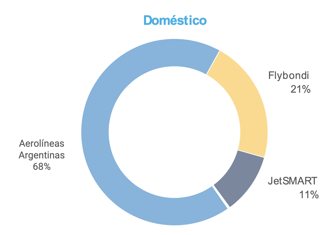 Vemos que Aerolíneas Argentinas mejoró la participación. La empresa envió comunicado que fue récord el verano con pasajeros transportados. Pero pasó del 63% al 68% de la torta. Flybondi llevó más pasajeros pero mantuvo la participación de la torta. En cambio Jetsmart perdió porque envió dos aviones a las otras filiales, por los problemas de los motores de los Airbus 320 NEO generales del mundo. Los de Argentina son la versión anterior y no tienen esos problemas