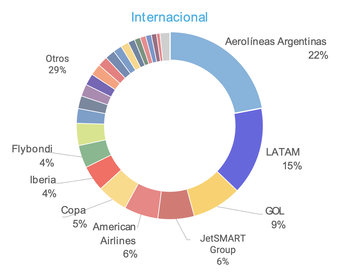 En la torta vemos como está INTERNACIONAL en general con Aerolíneas ganando con el 22% y Latam con el 15%