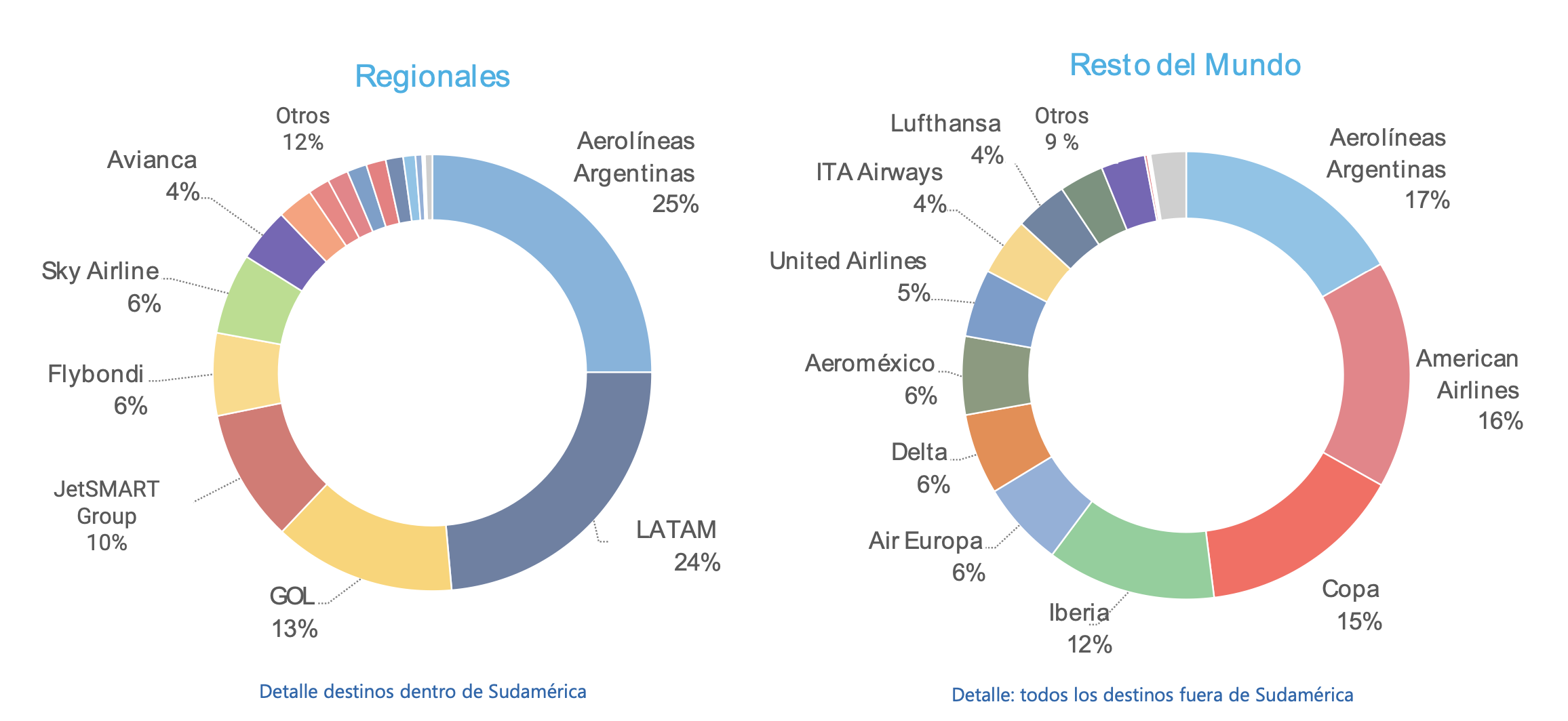 Pero si partimos eso en regionales y resto del mundo, siendo que regionales es SUDAMERICA, ahí Latam está solo un punto debajo de Aerolíneas y Gol tiene casi la mitad. Jetsmart con un notable 10% y Flybondi sin filiales como su prima, tiene el 6%, lo mismo que Sky.