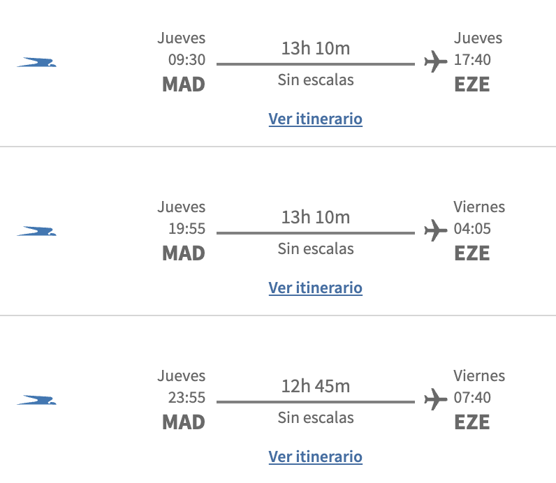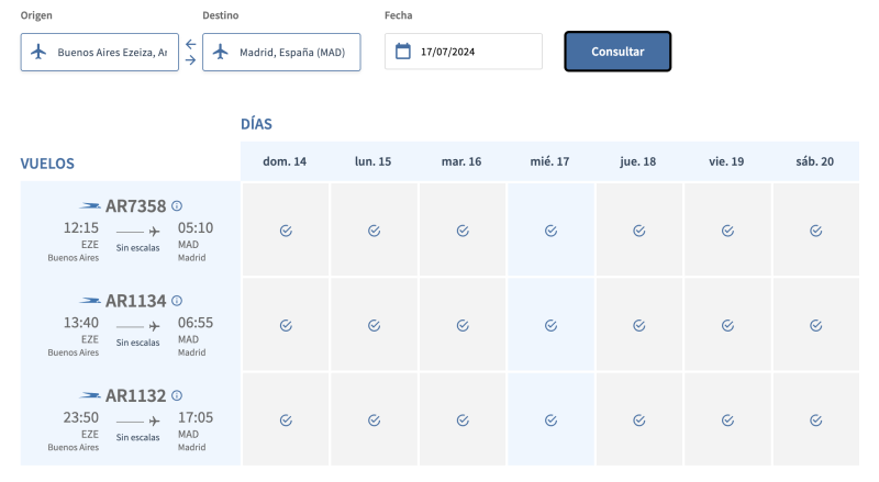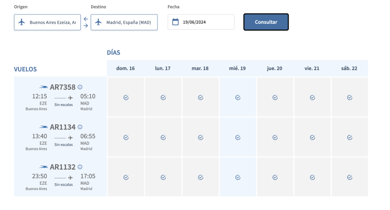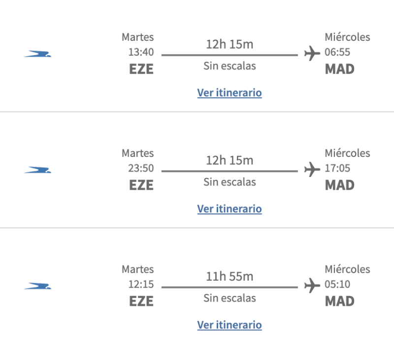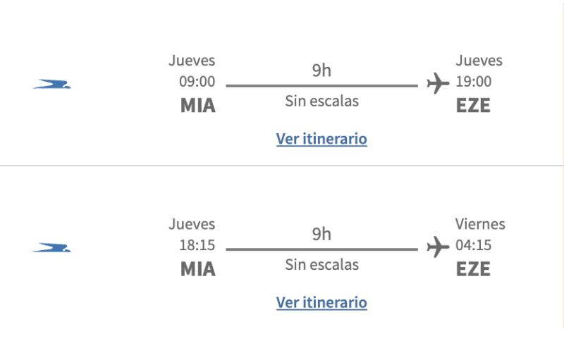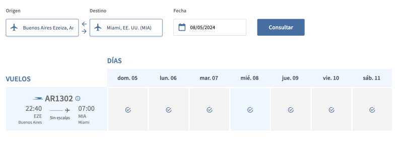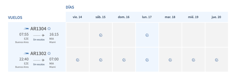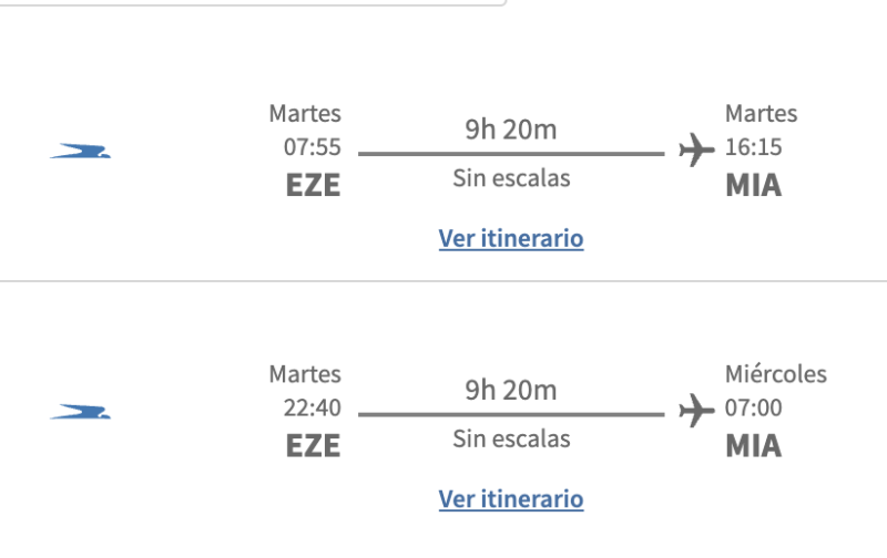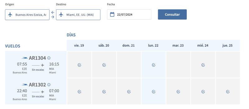 En el sistema de Aerolíneas Argentinas ya se puede ver el doble vuelo diario que tendrá la empresa con Miami y con Madrid desde el mes de julio, tal como se conoció hace unos días cuando se informó que daban de baja los 3 vuelos semanales que tienen con el JFK de New York.