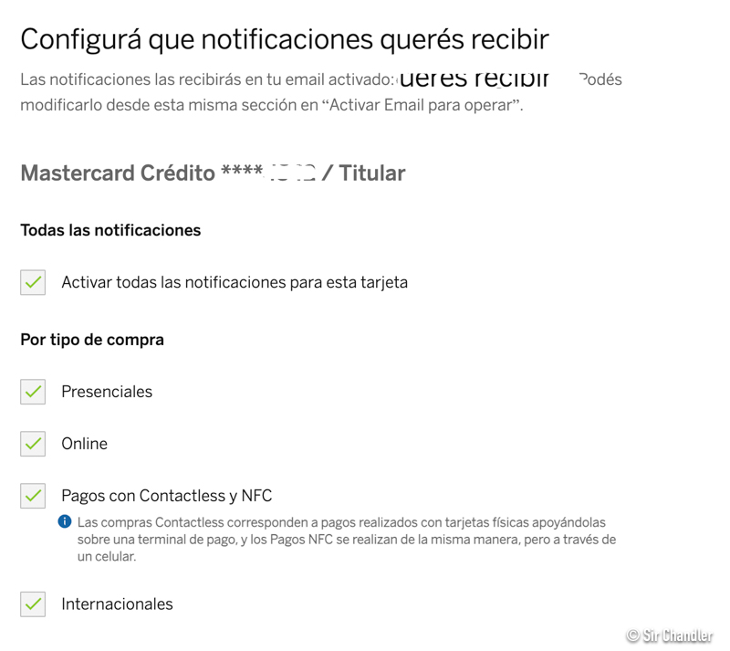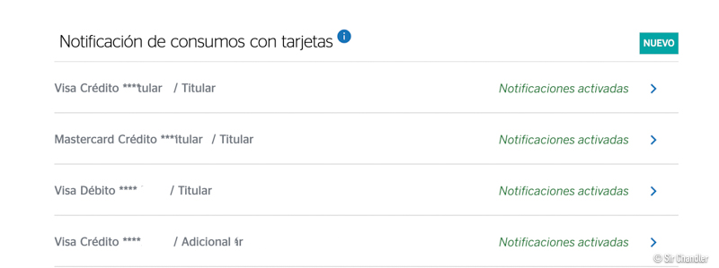 Ahí uno entra y están todas las notificaciones en general, pero en la parte de las tarjetas dice esto, donde yo ya habilité todo