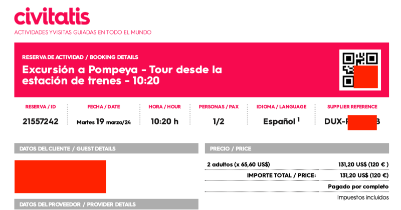 Al día siguiente hicimos el check out del hotel y dejamos ahí mismo las valijas sin problemas y nos fuimos a Pompeya. Esta si la había contratado previamente y en la reserva puse que nos subíamos en la estación central. Había dos opciones más, pero esta era la mejor para mi. Las instrucciones eran claras, afuera de un hotel específico frente a la estación central.