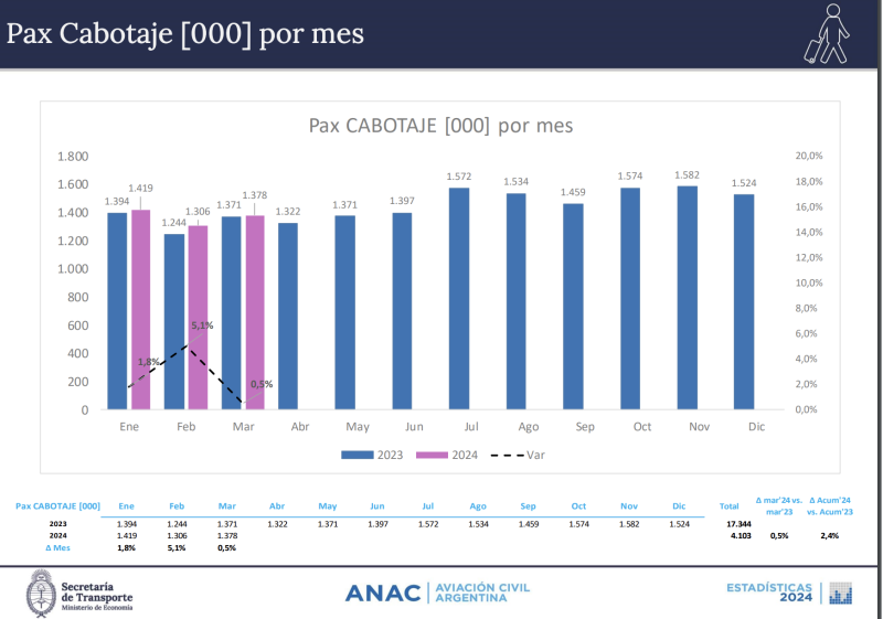 En marzo creció casi un 1% la cantidad de pasajeros de cabotaje, lo cual es notorio realmente en el contexto actual. Abril será el mes a comparar para ver como impactó ese gran movimiento de turistas que tuvo la semana santa, donde en 2023 también había estado en Abril.