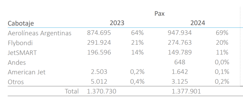 Acá el cuadro de participación de las tres aerolíneas en el mercado de cabotaje en marzo 2024