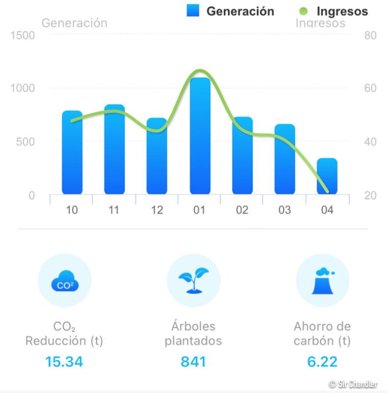 Cierro con el gráfico de lo generado (no inyectado) en estos últimos meses donde enero fue el mejor mes, cuando hace un año lo había sido diciembre. Pero entre las lluvias de ese mes y los cortes de Edesur no logré superarlo. Abril lógicamente está incompleto