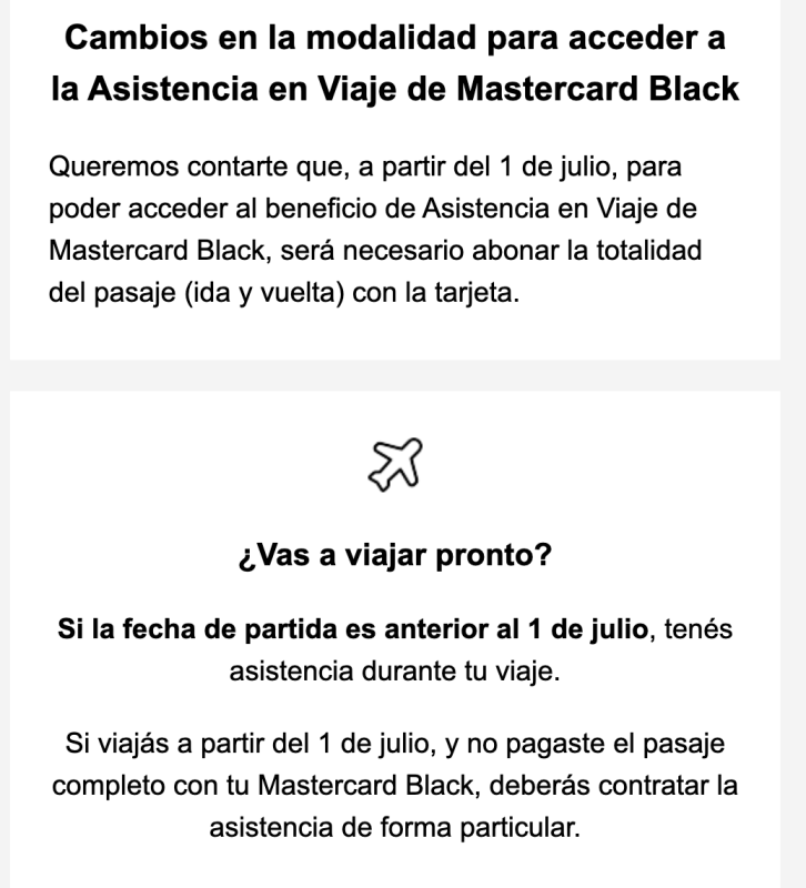 Ayer recibí mail del Banco Galicia donde informan que desde el 1° de julio la cobertura de asistencia en viajes que históricamente dio la Mastercard Bñack pasará a depender de si se pagó el pasaje o no con esta tarjeta.