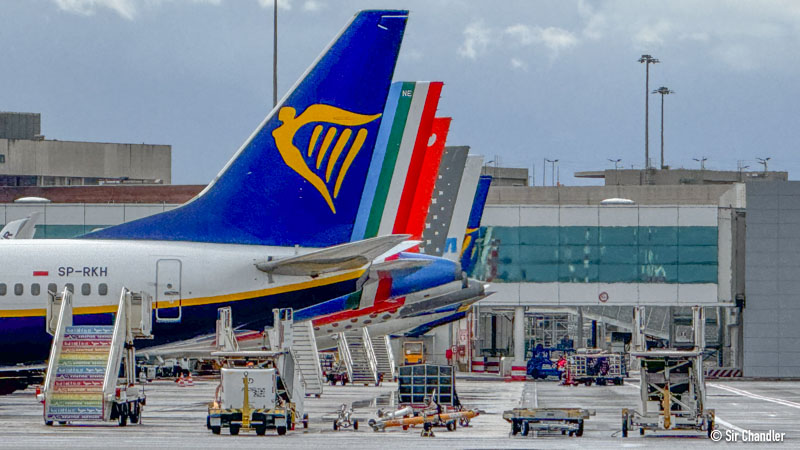 Y varios Ryanair por salir o llegando. Cuando yo volé por primera vez en Ryanair había sido desde el otro aeropuerto de Roma, Ciampino. No se como sigue ahora la operación, pero ahí tienen muchos aviones