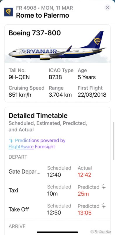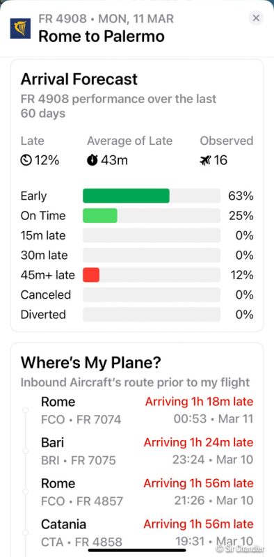 Datos en la app Flighty del vuelo, con estadísticas de cuantos demorados y que rutas había hecho el avión en si, que venía con demoras, pero como habían pasado tantas horas de su aterrizaje estaba en horario