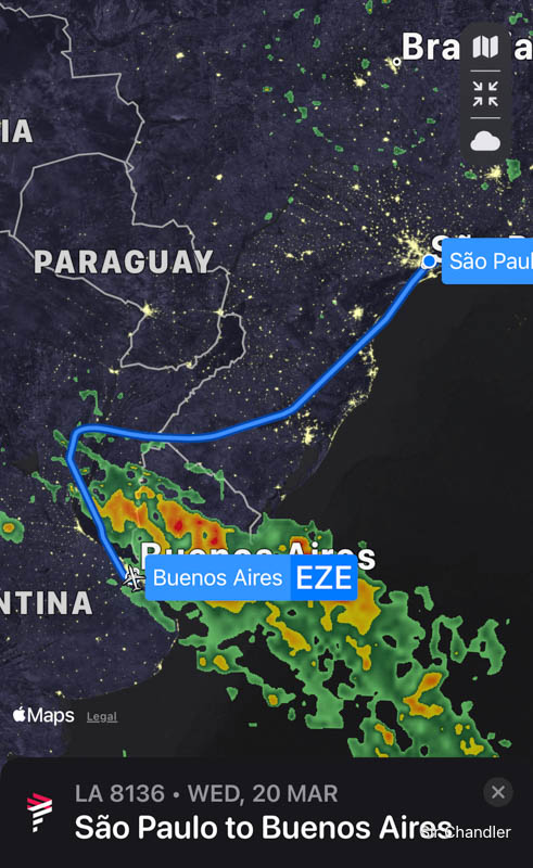 Despegamos y me dormí… sabía que había tormenta en Buenos Aires. Cuando me despierto busco en google maps por donde estábamos y era al norte de Santa Fe. Pensé que nos habían desviado a Córdoba y que nos complicaría todo… pero no, se fue acercando. Luego en el mapa de Flighty quedó el desvío y el testimonio de la gran razón… estaba muy heavy