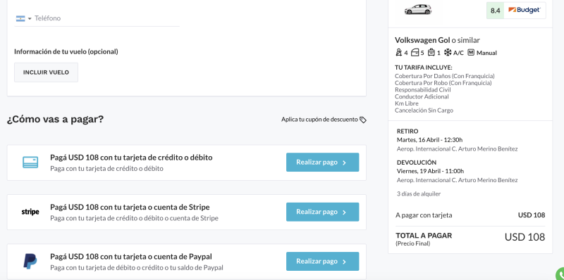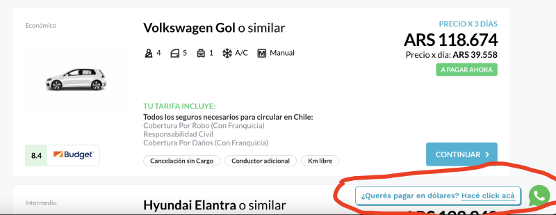 Que dicho sea de paso, hace un tiempo mostré que convenía cambiar de país en la home de bookingcars para pagar en USD… bueno ya no. Dejan Argentina, cotizan y les mostrará en pesos. Pero si se fijan ahí abajo dice ¡QUERES PAGAR EN DOLARES?
