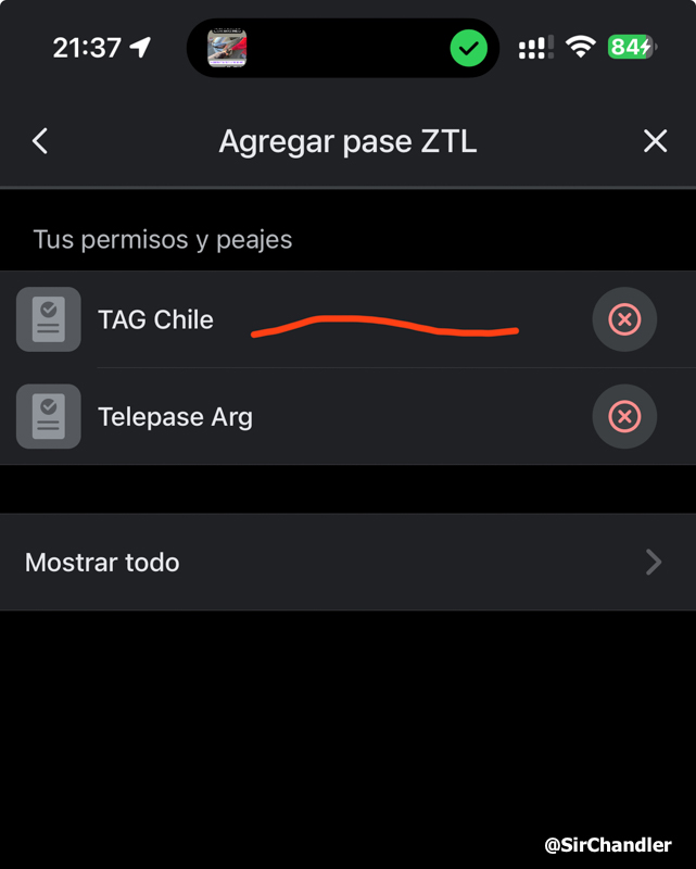 Ahi yo ya tenía el de TELEPASE ARG y abajo donde dice MOSTRAR TODO tenía a la vista el TAG CHILE