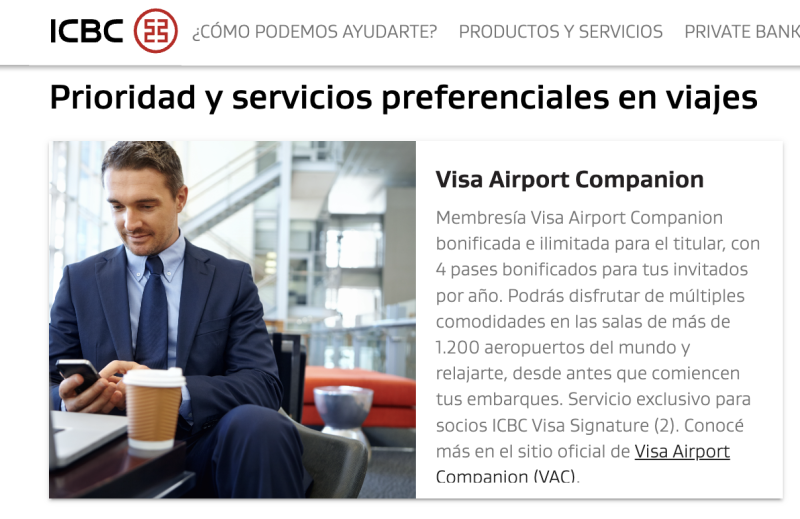 Con la tarjeta ICBC Visa Signature tenés una membresía Visa Airport Companion (VAC) bonificada e ilimitada como titular, con 4 pases bonificados para tus invitados por año. Podés disfrutar de múltiples comodidades en las salas de más de 1.200 aeropuertos del mundo y relajarte antes de tus embarques. Todos los servicios deberán ser reservados previamente. Para más información ingresar en Promociones de Visa.