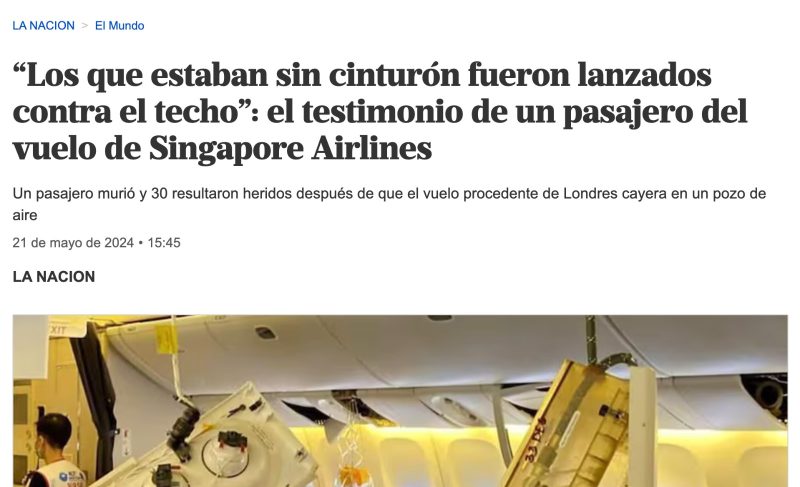 En este vuelo de Singapore hubo una persona fallecida pero ya se conocerán los motivos, pero los heridos, algunos de ellos tripulantes, fueron por no tener el cinturón de seguridad, ya que otros pasajeros reportan que volaron hacia el techo. Da lo mismo si los medios ponen que el avión bajó 30 metros o 1.300… el cinturón de seguridad siempre.