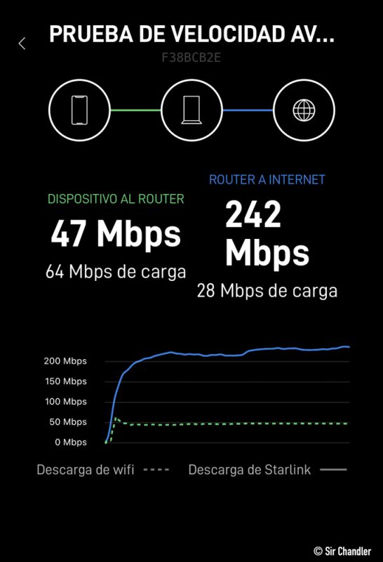 Acá la confirmación en la app de Starlink que la bajada en ese momento era de 242mb por la antena y al celular llegaban 47… EL ROUTER ES MALO