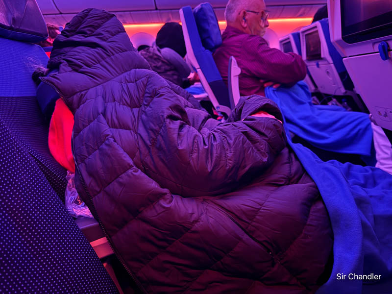 Para Europa, tampoco puedo dormir 🫠 así que trato de matar el tiempo con peli + almuerzo/cena, otra peli. Después intento dormir tapada con la manta y mi campera. Uso la almohada que te dan(si hay una que sobre, va a mi espalda) pero lo mismo. Cada hr me despierto. Cambio de posición. Hasta que termino mirando otra película.