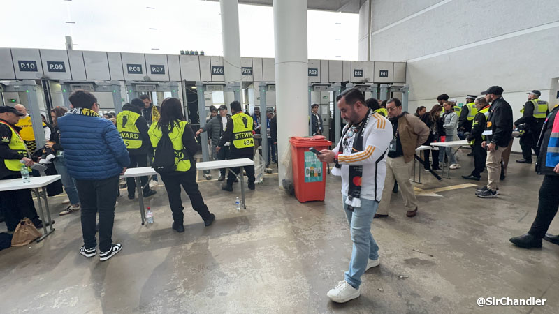 Nada de líquidos se podían entrar y si uno llevaba una batería extra, no podía ser más grande que el celular, según la web de la UEFA. Pasé por el detector y luego con los celulares y batería en la mano, me pasaron un detector manual por el cuerpo.
