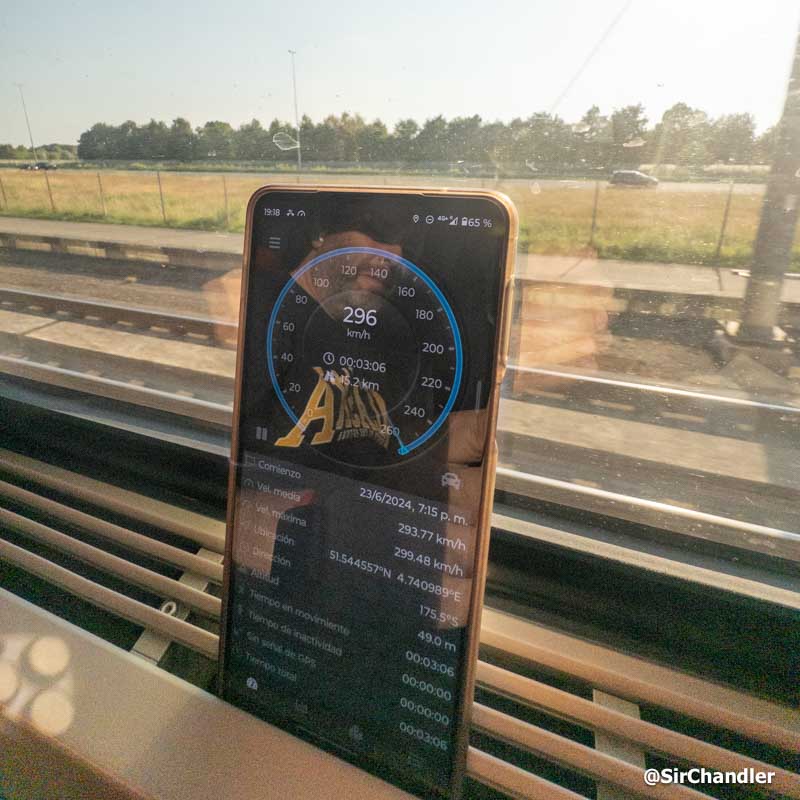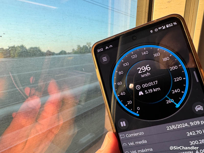 Como el Eurostar, llega a 300km por hora, pero siempre suelen ser toques y ronda algo menos (app Galileo GPS en Android)