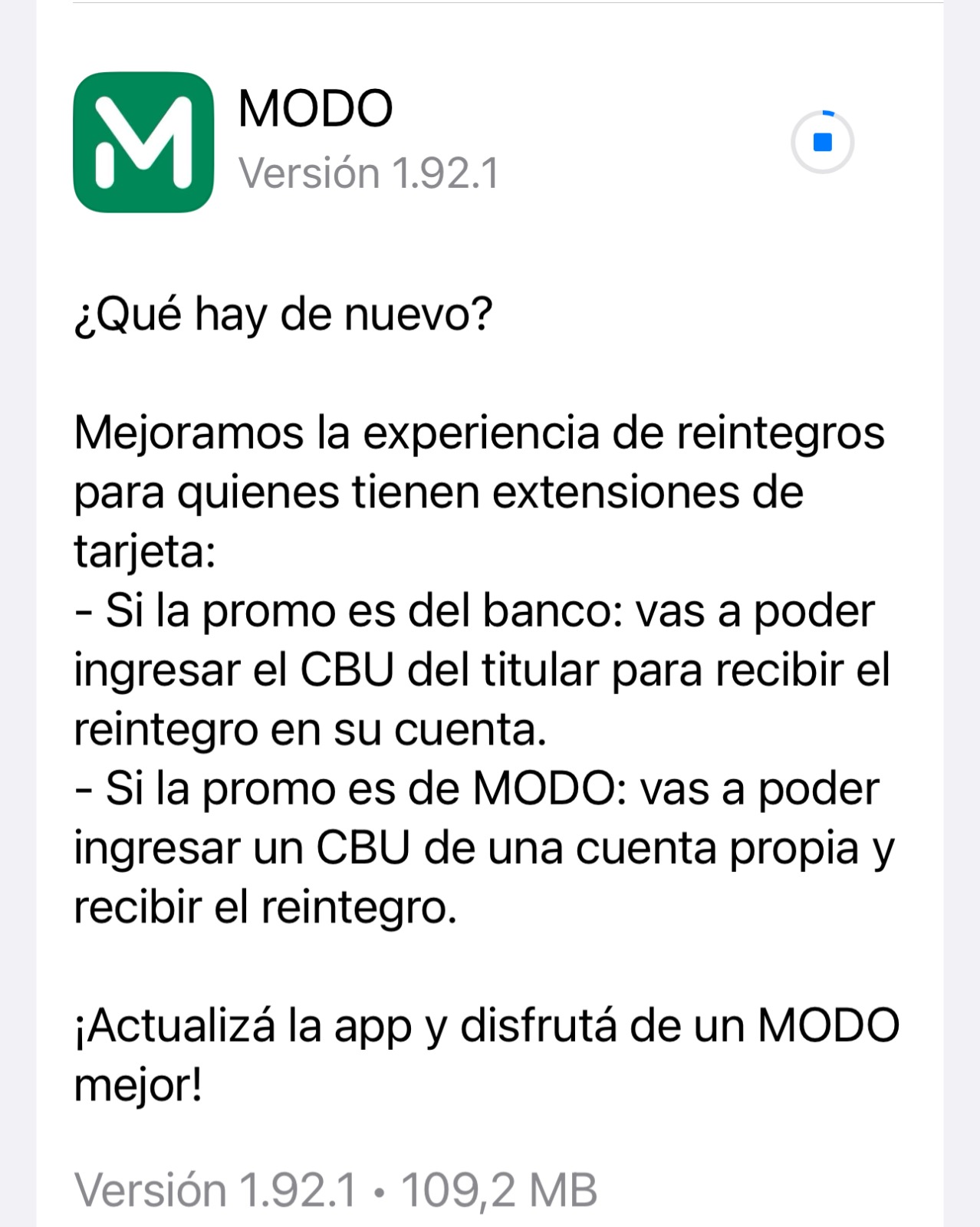 Ayer vi que saltó una actualización en la app de MODO en el iphone, por lo que estimo en Android también, para un problema que había visto tenían las promos de MODO o de los bancos cuando se usa MODO