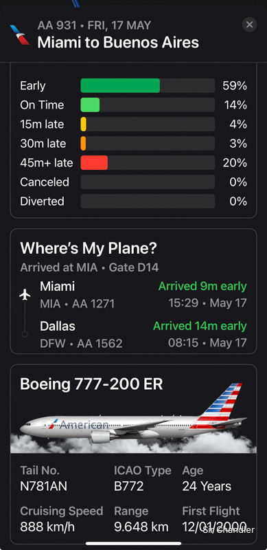 Estadísticas del vuelo según la app Flighty, con la edad del avión que demuestra que pueden volar muchos años