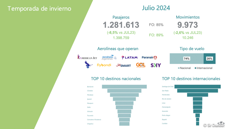 Y que en julio los vuelos fueron en un 74% nacionales y en un 26% regionales. Bariloche el más popular de cabotaje y Santiago el de regionales. No es sorpresa por ese lado