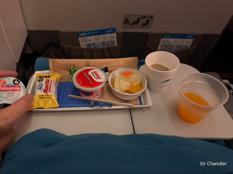 Desayuno con té, jugo, frutas, un yogurt y las galletitas de agua que se podían untar con el queso Patagonia. Los cubiertos en bolsita de papel