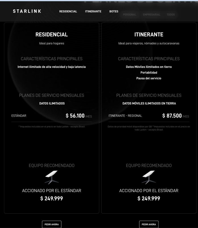 Igualmente en el sitio de Starlink está disponible y aparece incluso un valor más bajo de abono, porque dice 56.100 para el plan residencial FIJO sin movimiento y 87.500 con el que uno se puede mover, tipo casa rodante o quien se vaya a cualquier lado y se la lleve, como el gran Guido Rodriguez con su registro de pueblos por todo el país