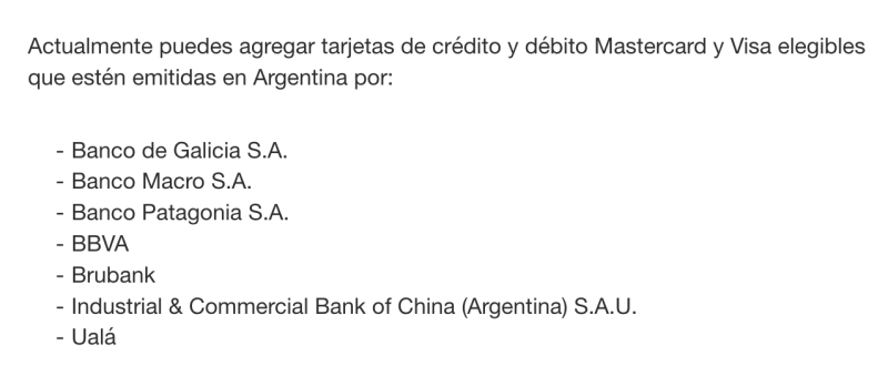 No sé el motivo pero las tarjetas Visa ya sea débito o crédito de ningún banco (tengo el BBVA, Galicia y ICBC) las puedo agregar a Apple Pay, figura un error de “Tarjeta no agregada