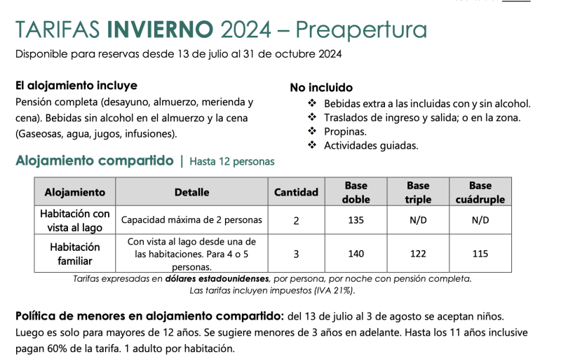 Si las tarifas son por habitación y se pueden pagar en pesos a la cotización del dólar oficial, no me parecen exorbitantes dependiendo, claro está, de la calidad de las comidas.