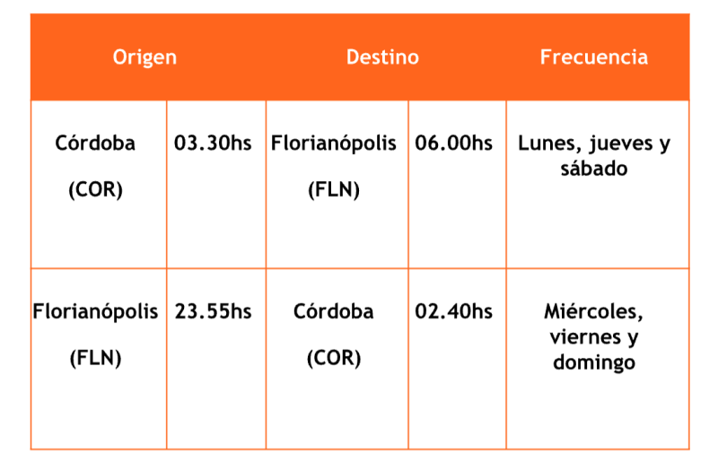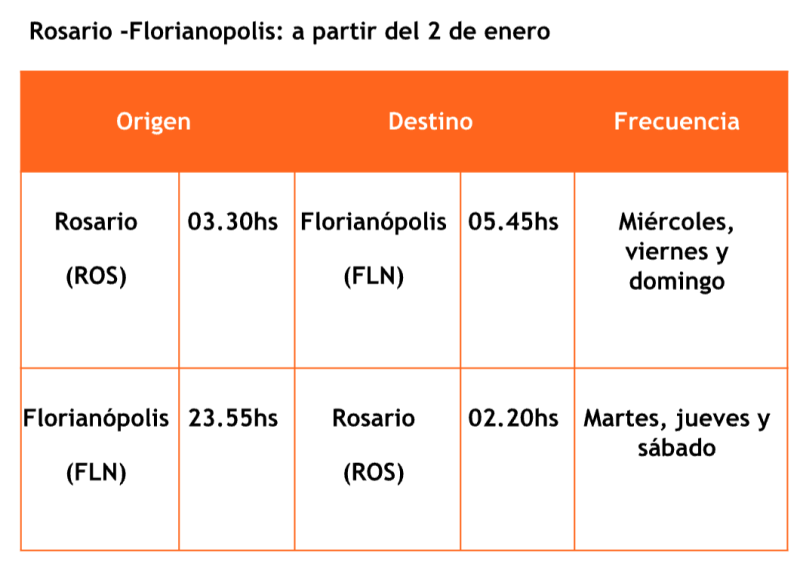 Básicamente por lo que se ve todos los días menos los martes desde Florianópolis sale al mismo horario o a Córdoba o a Rosario
