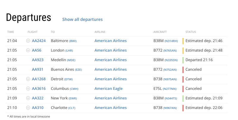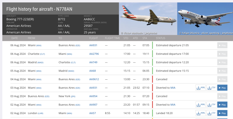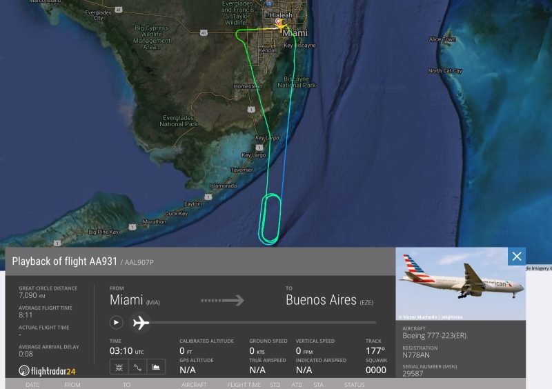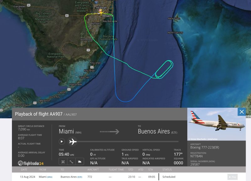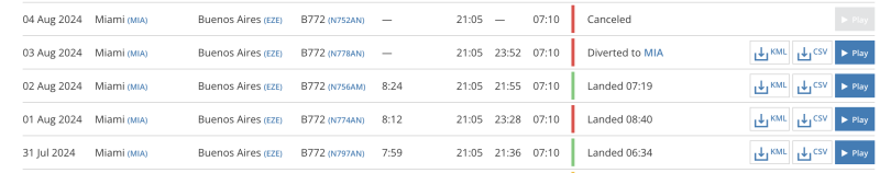 Ayer salieron muchas notas en los medios que hablan de 1.000 argentinos varados en Miami por vuelos cancelados. Si uno revisa en FR24 los AA931 que es el clásico Miami Ezeiza se ve que el 3 de agosto despegó y volvió a Miami… y el del 4 de agosto ya se suspendió
