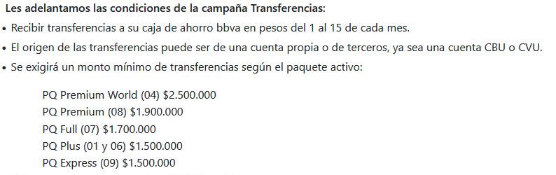 En estas horas el personal del BBVA recibió los montos por los cuales cada cliente podrá bonificar su paquete y no quedará atado a que uno mismo se lo mande desde otro banco. DE AHORA EN MÁS SON SIMPLES TRANSFERENCIAS DESDE CUALQUIER CBU O CVU DE CUALQUIER PERSONA/EMPRESA las que puedan computarse.