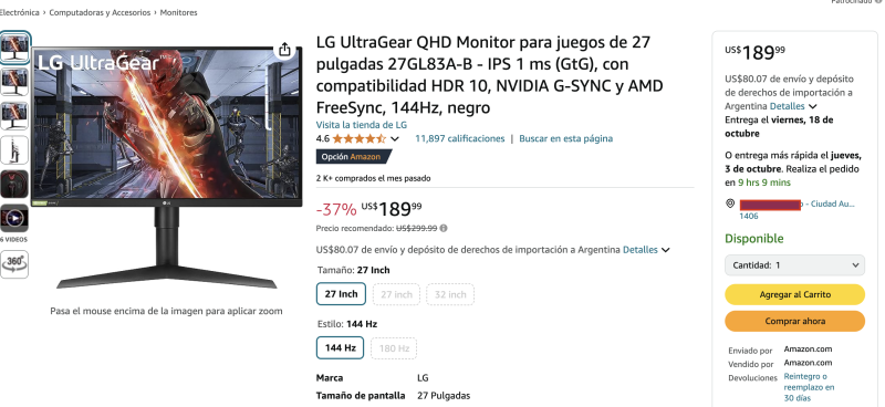 Ahí dice que llega el 18 de octubre o si se hace rápido puede ser el 3 de octubre (puede ser otro valor). Pero ahí en DETALLE, abajo del precio, es que se ven los cargos