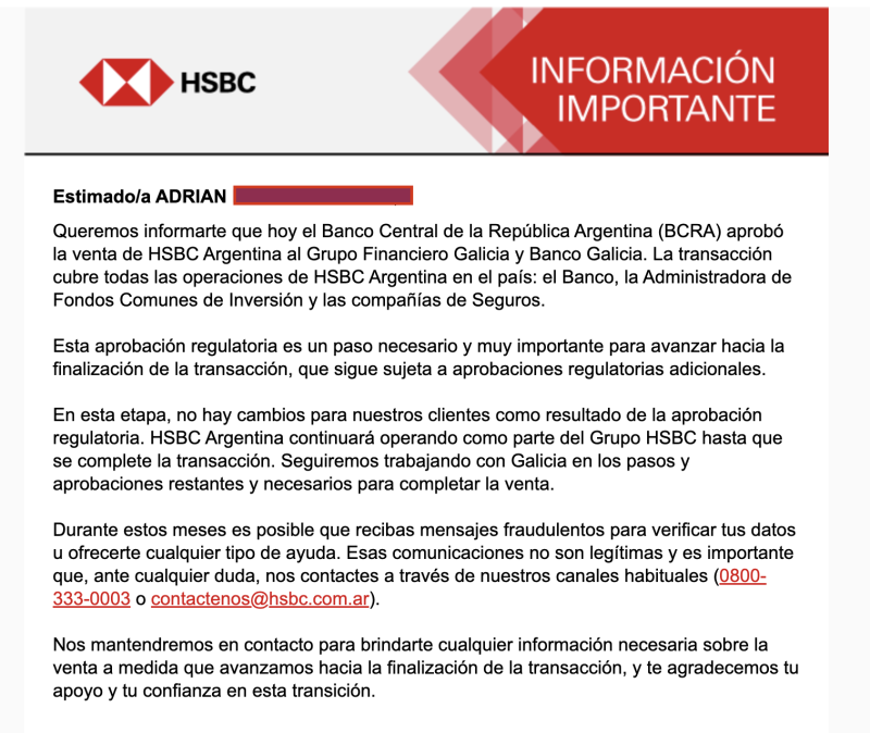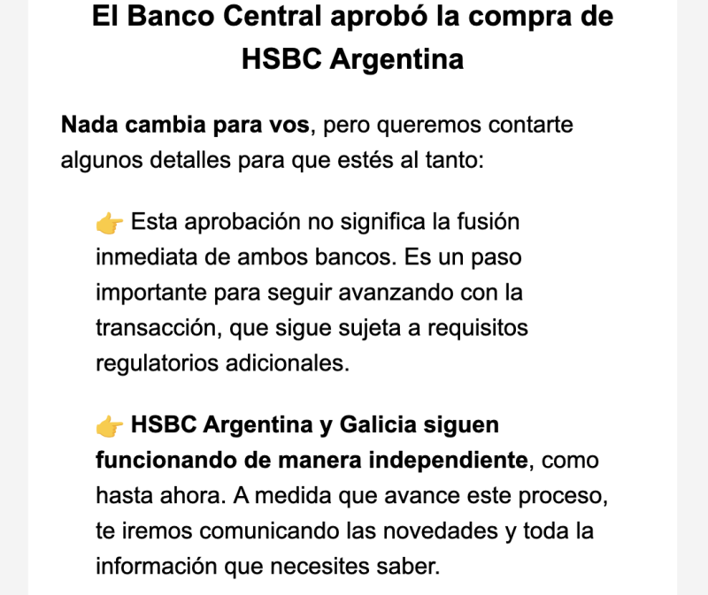 Ayer se conoció que el BCRA aprobó la compra del HSBC por parte del Banco Galicia. Esto motivó que los dos bancos enviaran un mail a sus respectivos clientes.