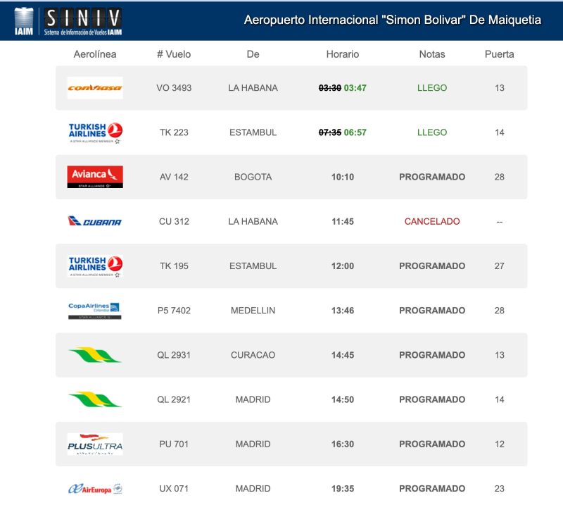Igualmente Avianca hoy sigue volando desde Bogotá (aunque acá aclara aviacionline que son solo 4 vuelos por semana). Como también las aerolíneas europeas que nunca cortaron esos vuelos. También en el cuadro se ve el logo de COPA, pero en realidad el vuelo es de WINGO que es la low cost de la panameña con base en Colombia y si está volando.