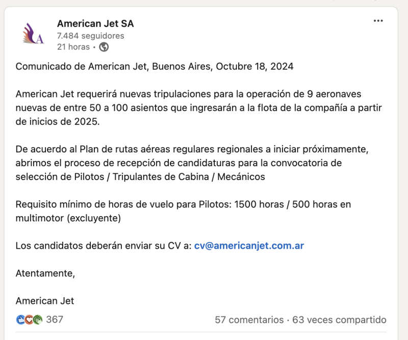 Ayer en el linkedin de American Jet publicaron que sumarán 9 aviones nuevos a la flota de entre 50 y 100 asientos, para operar un plan de rutas regulares. Esto sería desde inicios de 2025.